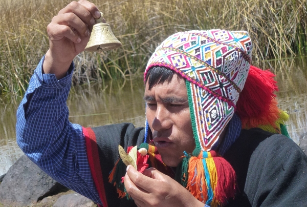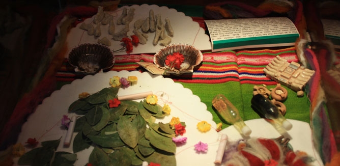 The shamans of the reading ceremonies of the leaves are made on a handmade fabric and red. Before it was done on a pre-Inca mantle, a religious image (usually a picture of the Virgin of La Candelaria) and a bronze bell.